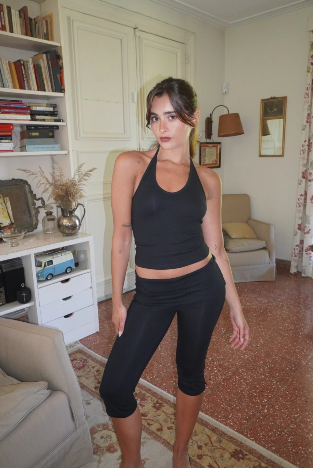 Capri pant con cintura embolsada. Confeccionado en algodon con lycra. Usalo en set con nuestro Nuria Halter Top Negro
