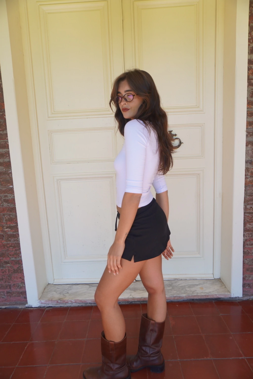 Mini negra confeccionada en algodon con lycra, con short integrado por dentro para mayor comodidad y lazos en la cintura decorativos. Usala en set con nuestro Nuria Halter Top Negro