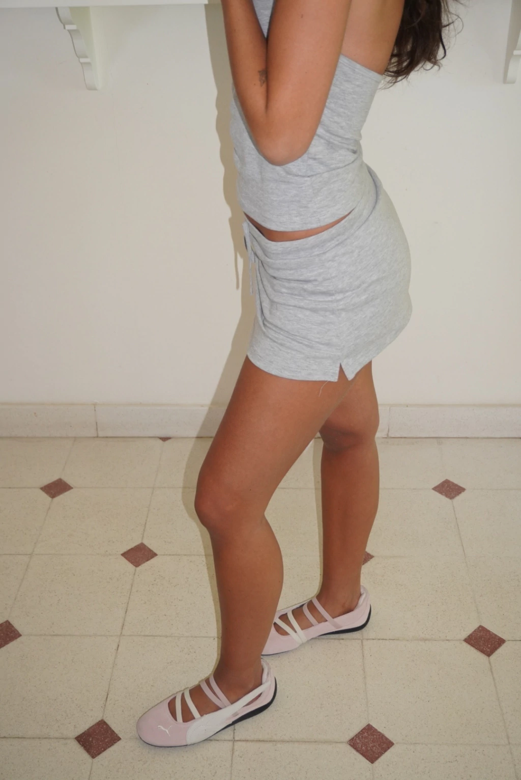Mini gris confeccionada en algodon con lycra, con short integrado por dentro para mayor comodidad y lazos en la cintura decorativos. Usala en set con nuestro Nuria Halter Top Gris